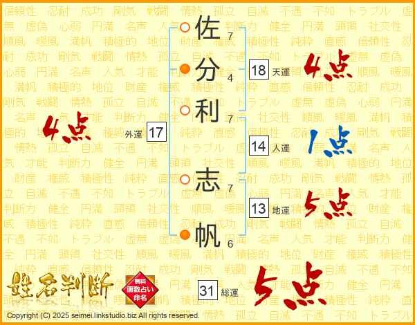 佐(7画)分(4画)利(7画) 志(7画)帆(6画)