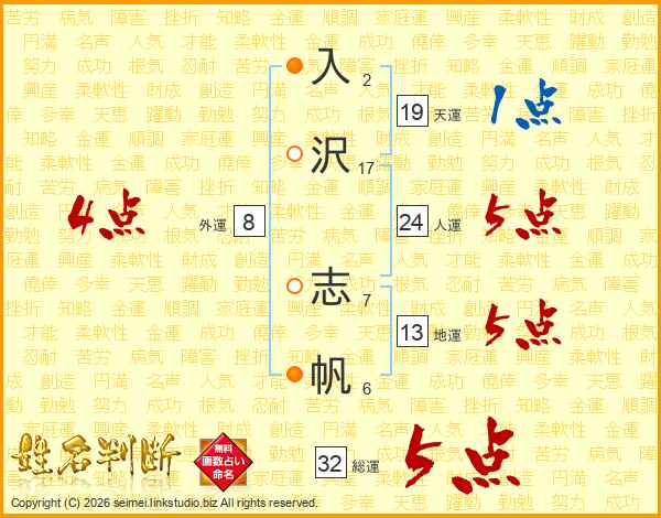 入(2画)沢(17画) 志(7画)帆(6画)