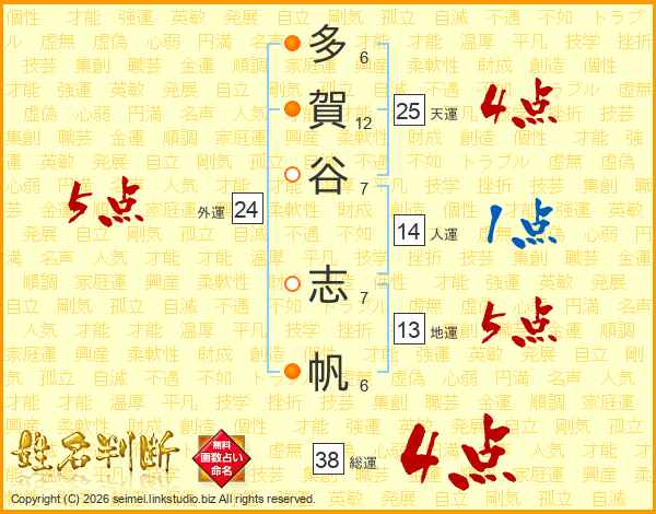 多(6画)賀(12画)谷(7画) 志(7画)帆(6画)