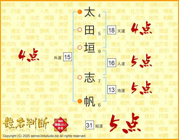 太(4画)田(5画)垣(9画) 志(7画)帆(6画)