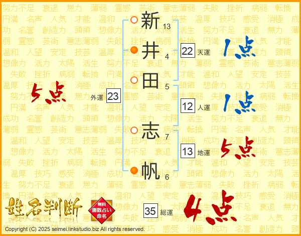 新(13画)井(4画)田(5画) 志(7画)帆(6画)