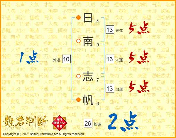 生活面を象徴する運勢です。外部から受ける影響力を表し、結婚運、家庭運や職場、環境への順応性を表します。総運から人運を引いた画数。姓や名が1文字の場合を除く。