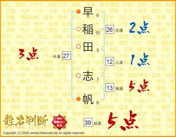 早(6画)稲(15画)田(5画) 志(7画)帆(6画)
