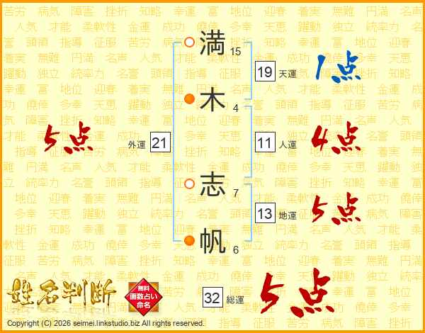 満(15画)木(4画) 志(7画)帆(6画)