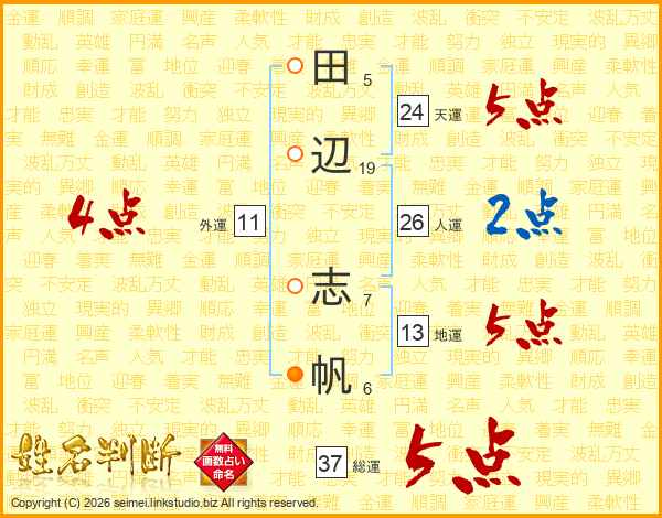 生活面を象徴する運勢です。外部から受ける影響力を表し、結婚運、家庭運や職場、環境への順応性を表します。総運から人運を引いた画数。姓や名が1文字の場合を除く。