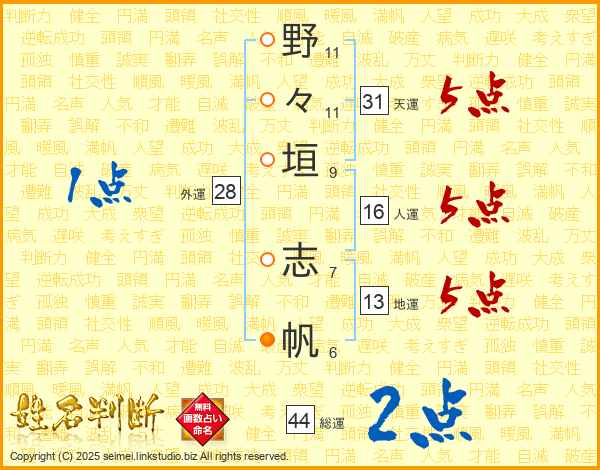 野(11画)々(11画)垣(9画) 志(7画)帆(6画)