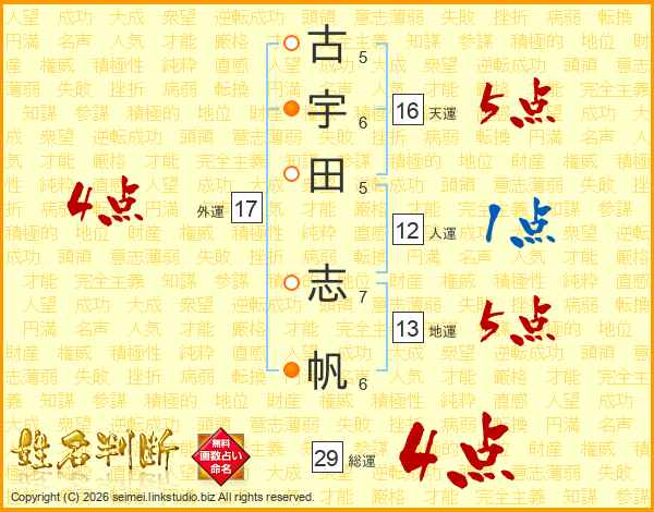 古(5画)宇(6画)田(5画) 志(7画)帆(6画)