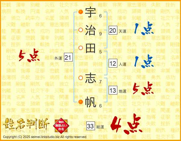 宇(6画)治(9画)田(5画)  志(7画)帆(6画)