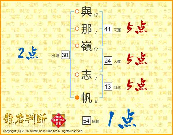 與(17画)那(7画)嶺(17画) 志(7画)帆(6画)