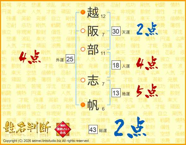 越(12画)阪(7画)部(11画) 志(7画)帆(6画)