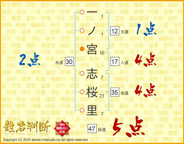 一ノ宮志桜里さんの総運は47画の5点!