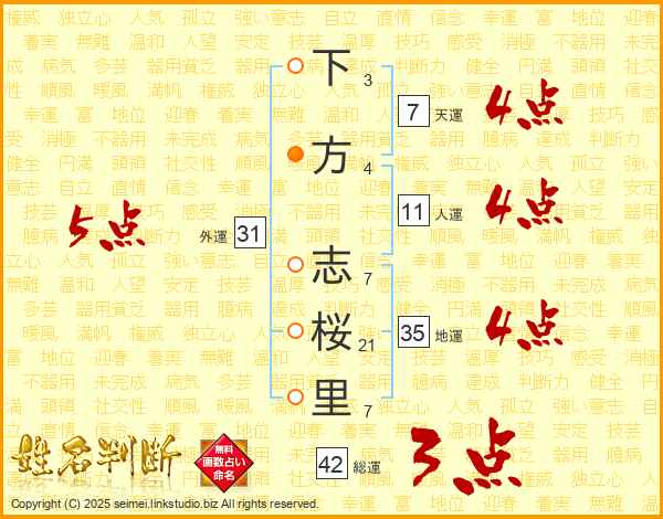 下(3画)方(4画) 志(7画)桜(21画)里(7画)