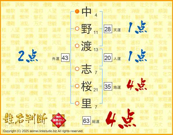 中(4画)野(11画)渡(13画) 志(7画)桜(21画)里(7画)