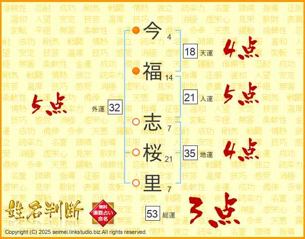 今(4画)福(14画) 志(7画)桜(21画)里(7画)