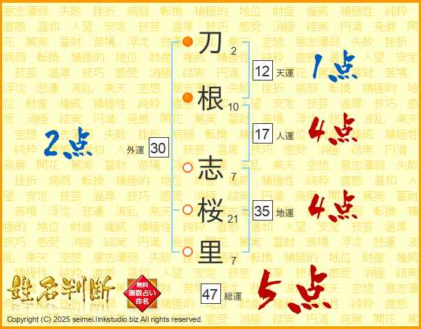 刀(2画)根(10画) 志(7画)桜(21画)里(7画)