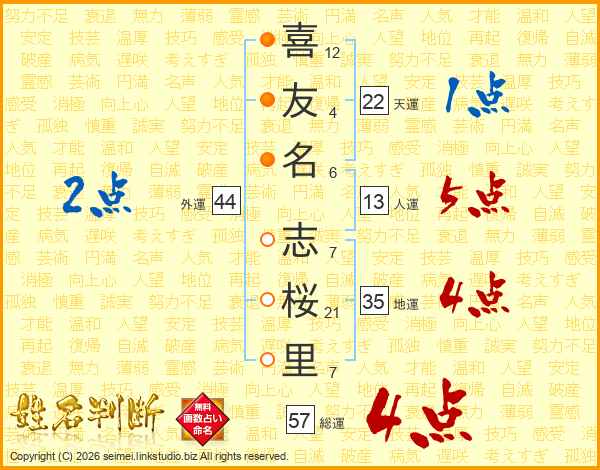 喜(12画)友(4画)名(6画) 志(7画)桜(21画)里(7画)