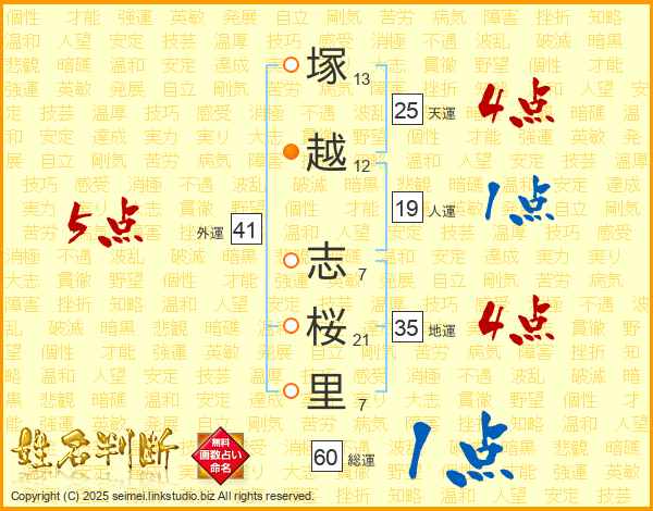 塚(13画)越(12画) 志(7画)桜(21画)里(7画)
