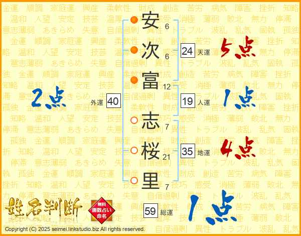 安(6画)次(6画)富(12画) 志(7画)桜(21画)里(7画)