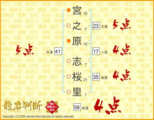 宮(10画)之(3画)原(10画) 志(7画)桜(21画)里(7画)