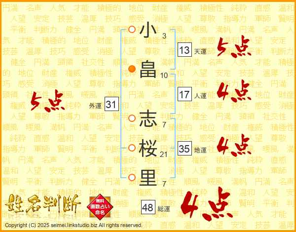 小(3画)畠(10画) 志(7画)桜(21画)里(7画)