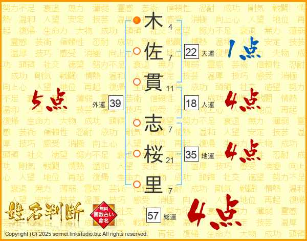 木(4画)佐(7画)貫(11画) 志(7画)桜(21画)里(7画)