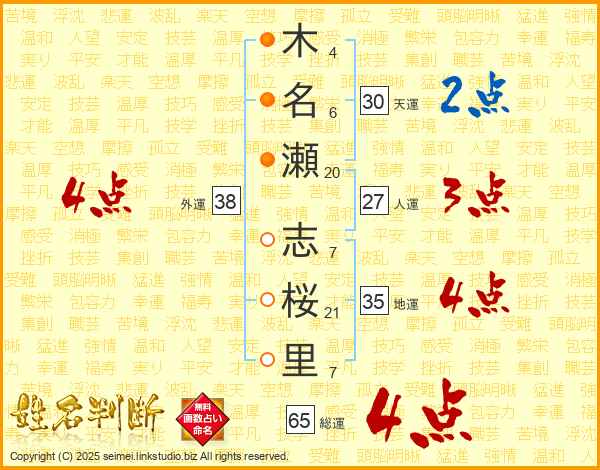木(4画)名(6画)瀬(20画) 志(7画)桜(21画)里(7画)