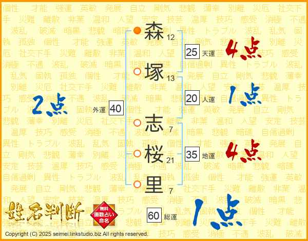 森(12画)塚(13画) 志(7画)桜(21画)里(7画)