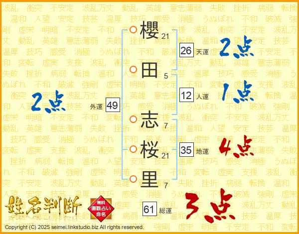 櫻(21画)田(5画) 志(7画)桜(21画)里(7画)