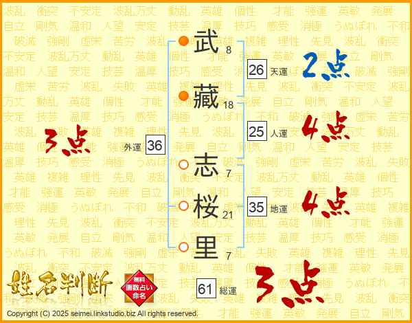 武(8画)藏(18画) 志(7画)桜(21画)里(7画)