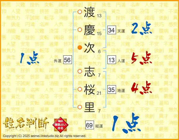 渡(13画)慶(15画)次(6画) 志(7画)桜(21画)里(7画)