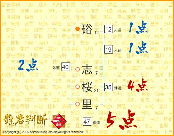 硲志桜里さんの総運は47画の5点!