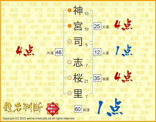 神(10画)宮(10画)司(5画) 志(7画)桜(21画)里(7画)