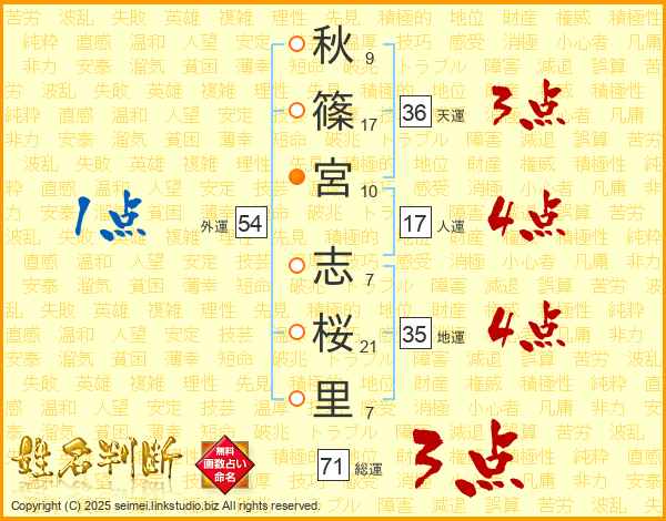 秋(9画)篠(17画)宮(10画) 志(7画)桜(21画)里(7画)