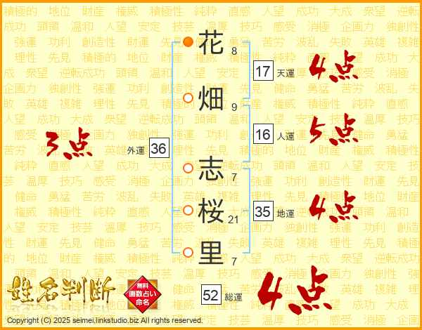花(8画)畑(9画) 志(7画)桜(21画)里(7画)