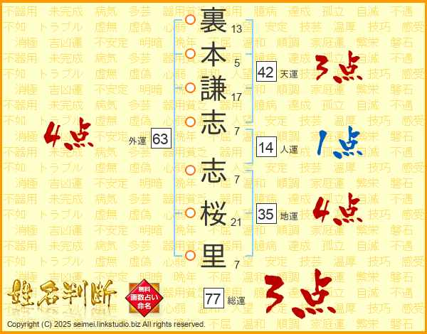 裏(13画)本(5画)謙(17画)志(7画) 志(7画)桜(21画)里(7画)