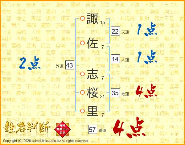 諏(15画)佐(7画) 志(7画)桜(21画)里(7画)