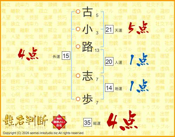 古(5画)小(3画)路(13画) 志(7画)歩(7画)