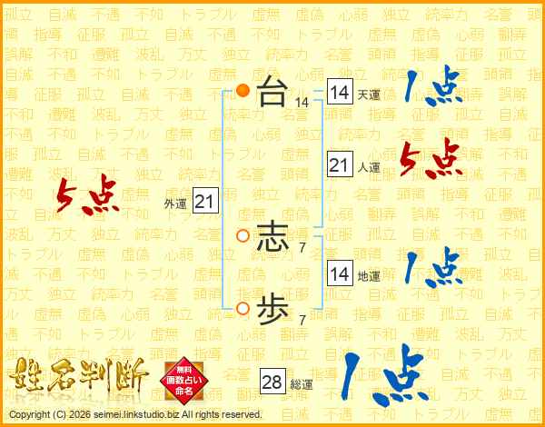 生活面を象徴する運勢です。外部から受ける影響力を表し、結婚運、家庭運や職場、環境への順応性を表します。総運から人運を引いた画数。姓や名が1文字の場合を除く。