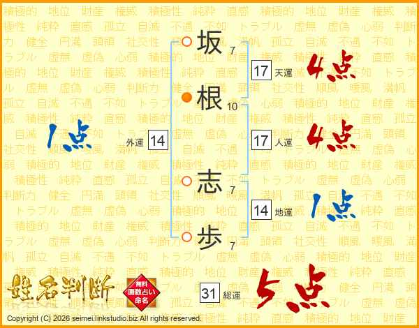 坂(7画)根(10画) 志(7画)歩(7画)