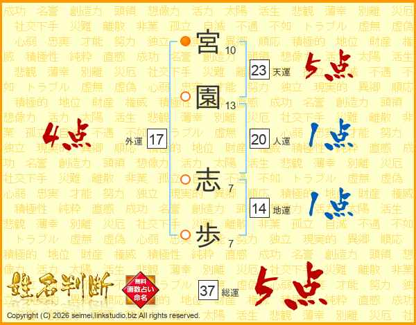 宮(10画)園(13画) 志(7画)歩(7画)