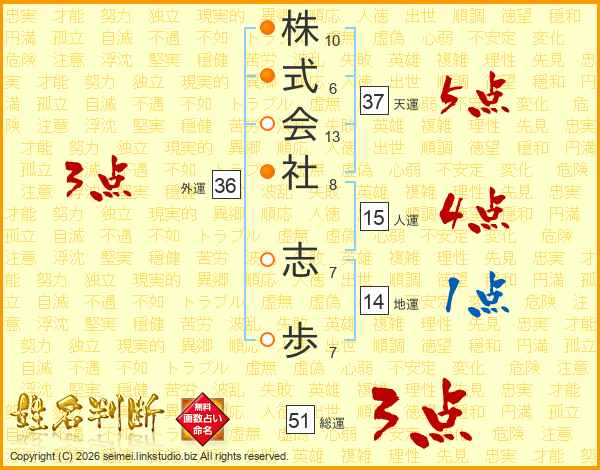 株(10画)式(6画)会(13画)社(8画) 志(7画)歩(7画)