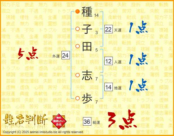 種(14画)子(3画)田(5画) 志(7画)歩(7画)