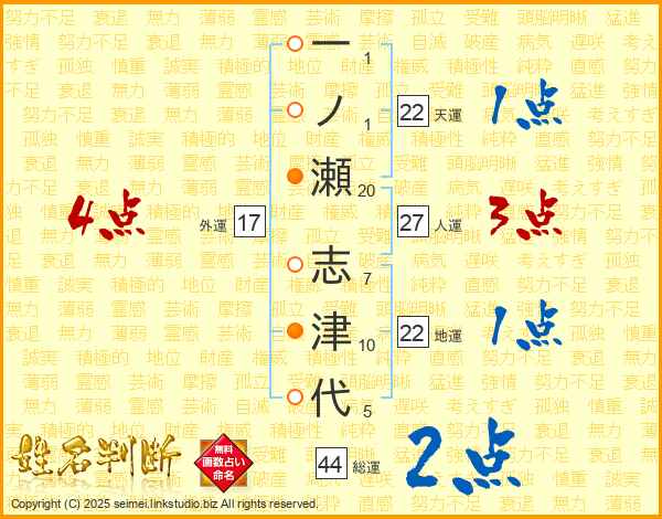 一(1画)ノ(1画)瀬(20画) 志(7画)津(10画)代(5画)