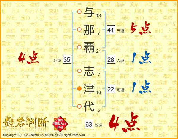 与(13画)那(7画)覇(21画) 志(7画)津(10画)代(5画)