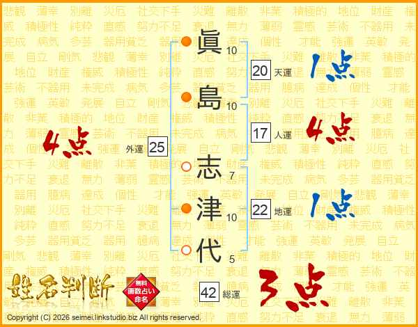 眞(10画)島(10画) 志(7画)津(10画)代(5画)
