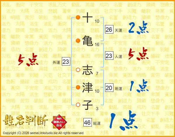 十(10画)亀(16画) 志(7画)津(10画)子(3画)