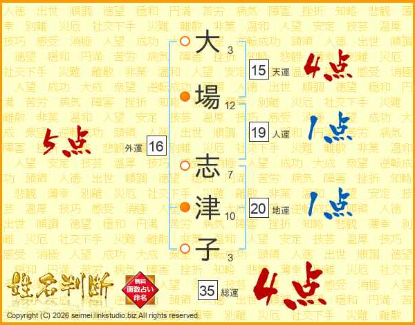 大(3画)場(12画) 志(7画)津(10画)子(3画)
