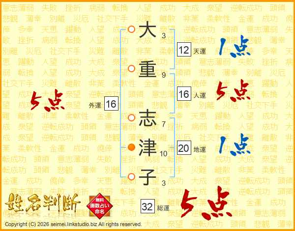 大(3画)重(9画) 志(7画)津(10画)子(3画)