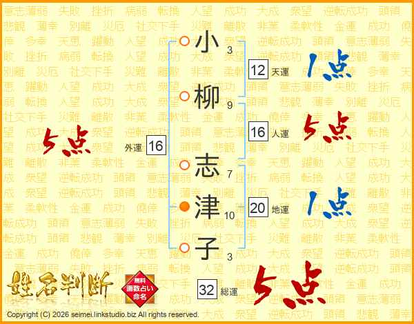 小(3画)柳(9画) 志(7画)津(10画)子(3画)
