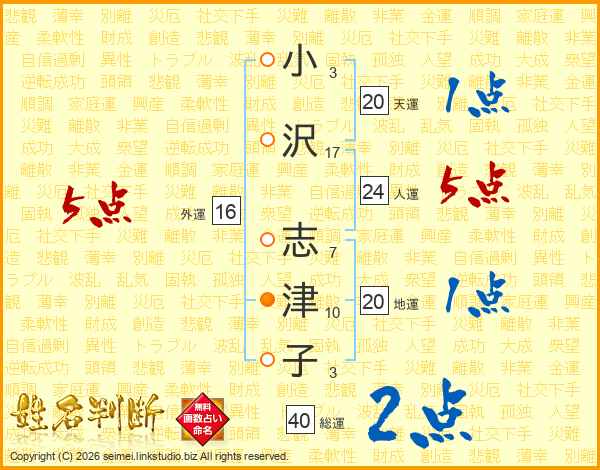 小(3画)沢(17画) 志(7画)津(10画)子(3画)